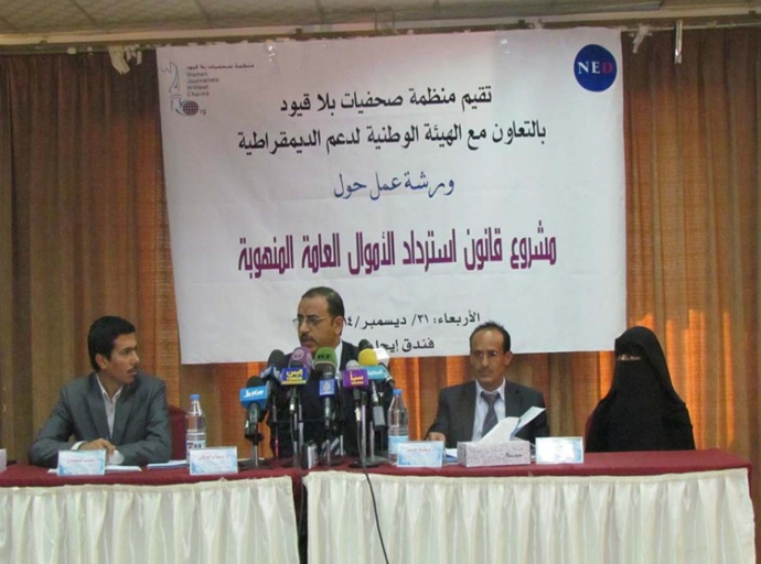 نظمت منظمة صحفيات بلا قيود ب التعاون مع الهيئة الوطنية لدعم الديمقراطية ورشة العمل الخاصة " بمشروع قانون استرداد الأموال العامة المنهوبة اليوم الأربعاء.