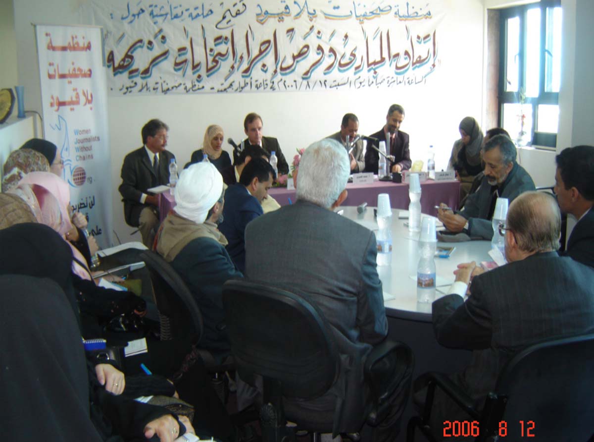 عقدت منظمة صحفيات بلا قيود، اليوم السبت، حلقة نقاشية بعنوان "اتفاق المبادئ وفرص إجراء انتخابات نزيهة"، بحضور الصف الأول من قيادات أحزاب تكتل اللقاء المشترك وتغيب ممثل حزب المؤتمر الشعبي العام رغم الاتفاق والتنسيق المسبق معه.