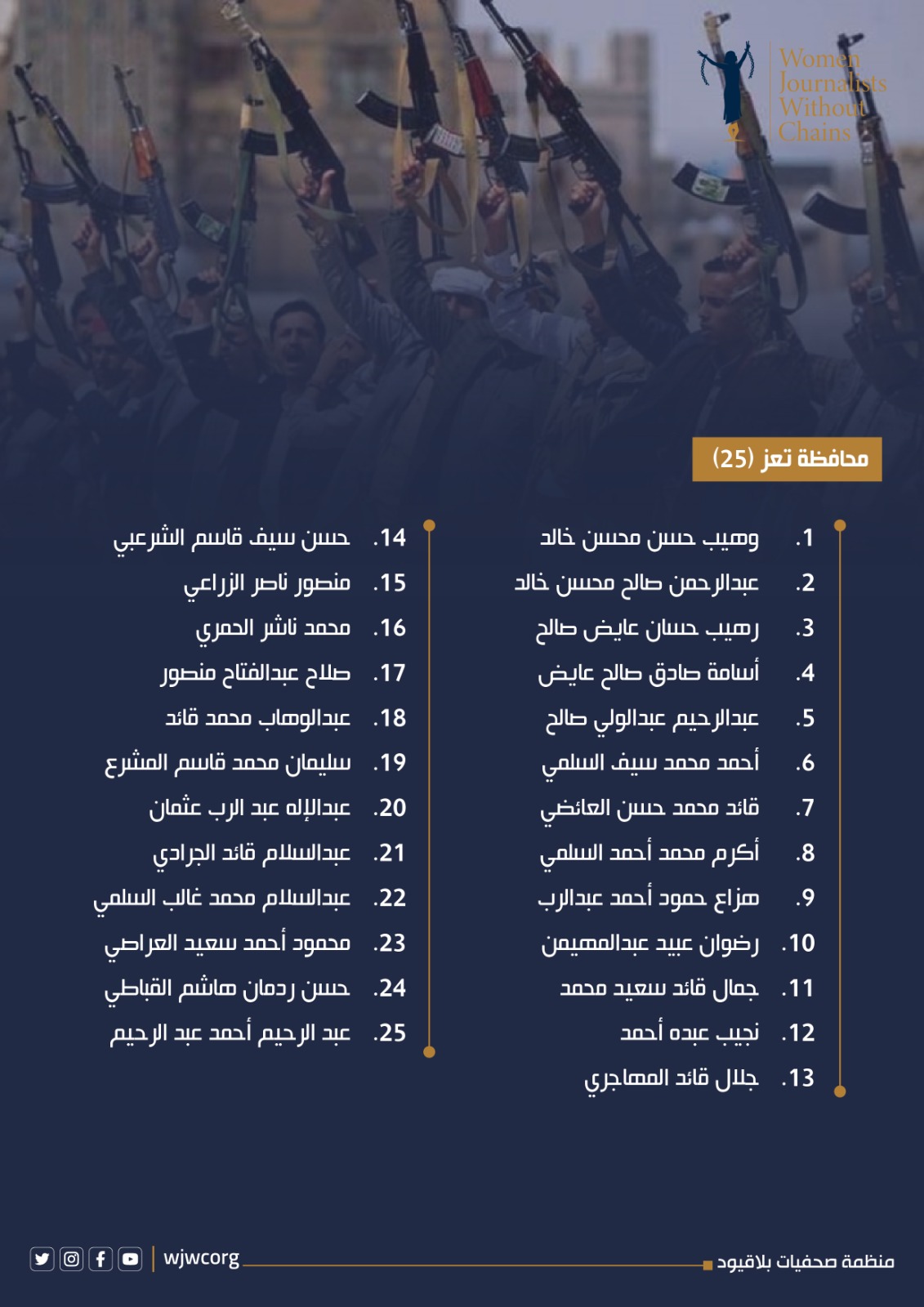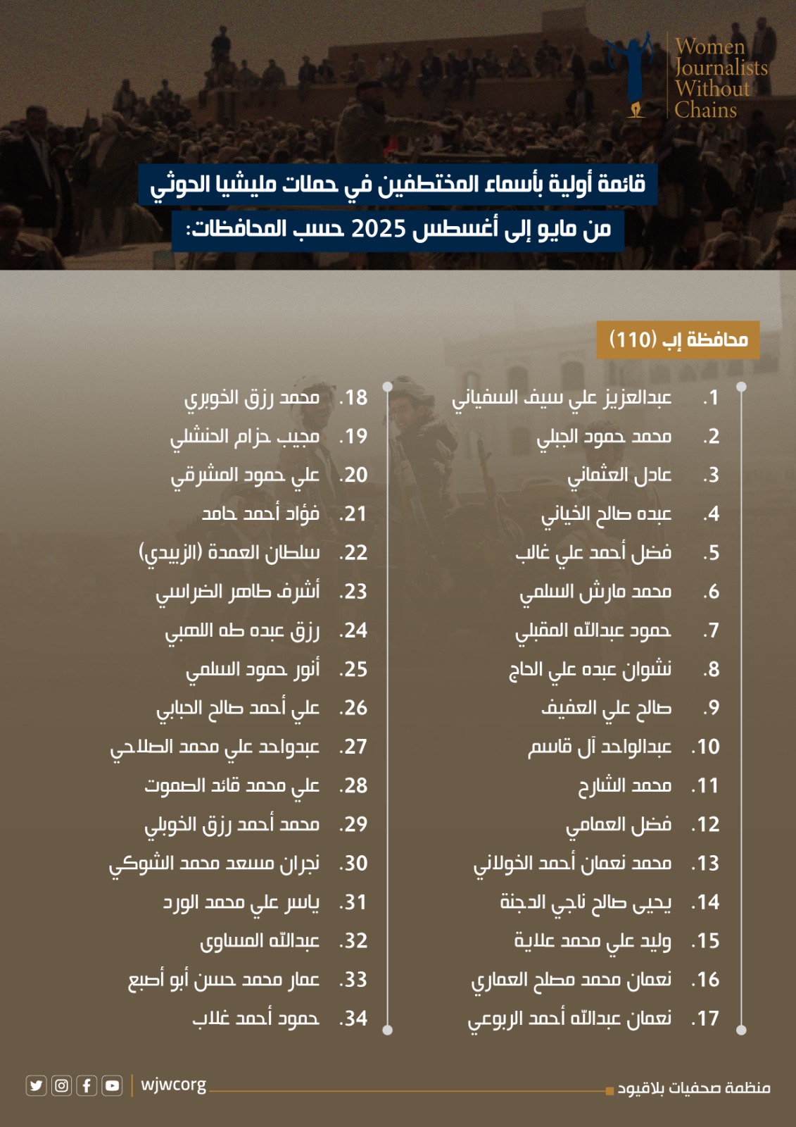 وفي إطار جهودها في الرصد والتوثيق، أكدت منظمة صحفيات بلا قيود أنها وثقت قائمة تضم (186) مختطفاً اختطفتهم مليشيا الحوثي خلال الفترة من مايو وحتى أغسطس 2025 في سبع محافظات على النحو الآتي: إب (110)، تعز (25)، صنعاء (19)، ريمة (12)، الحديدة (9)، البيضاء (8)، وذمار (3).